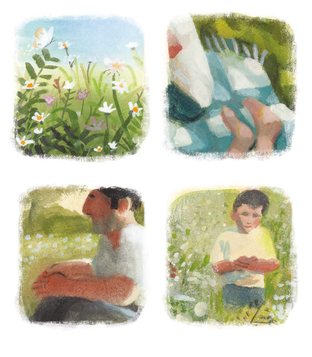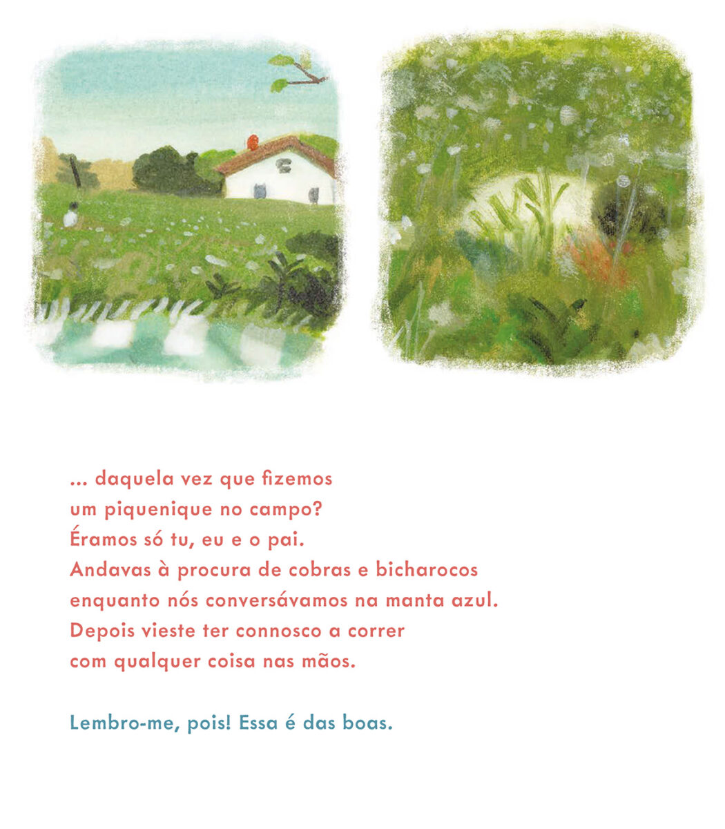 A ilustração segue a mesma lógica, a partir do olhar de quem está no momento a falar. O leitor vê o que a personagem recorda com os seus olhos. Esta estrutura enriquece o sentido da narrativa: o leitor acede à recordação visual das personagens e ao que valorizaram naquele episódio, sejam as framboesas nas mãos juntas, os pais sentados na manta, a queda no monte de feno, o cheiro a petróleo ou os relâmpagos na tempestade. Em cada história, mudam os tons e as cores, o nível de definição dos elementos e a relação entre luz e sombra, criando-se ambientes que provocam sensações distintas. Destas recordações, mãe e filho passam para a mudança de casa, que se percebe envolver emoções mais complexas.