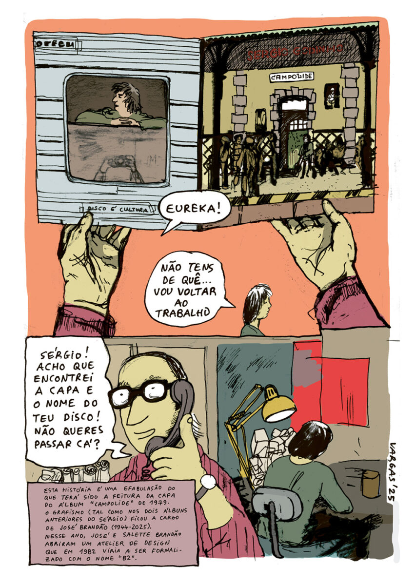 A primeira banda desenhada de O Meu Sérgio é da autoria de José Smith Vargas e encena, de algum modo, aquilo que terá sido o processo de realização da capa do álbum Campolide, gravado em 1979. Trata-se, como é sabido, do disco que tem na capa um Sérgio Godinho espreitando pela janela de um comboio e o que Smith Vargas faz a partir do que se sabe sobre esse processo é um bom prelúdio para o que se guarda nestas páginas a várias mãos. Longe da tentação biográfica e hagiográfica, ainda mais longe de um entendimento rasteiro sobre a banda desenhada enquanto ferramenta de simplificação (tão comum em projectos que cruzam BD e biografia), este livro é um espaço de liberdade, construído colectivamente, onde as vozes individuais não se perdem, mesmo quando cantam em coro. E esta voz individual, a que nos conta a história de como José Brandão, que com Salette Brandão havia fundado há pouco o atelier de design B2, chegou à capa de Campolide, mas também ao miolo desse formato álbum de vinil, capa cartonada e aberta, que permitia um trabalho gráfico e visual único.