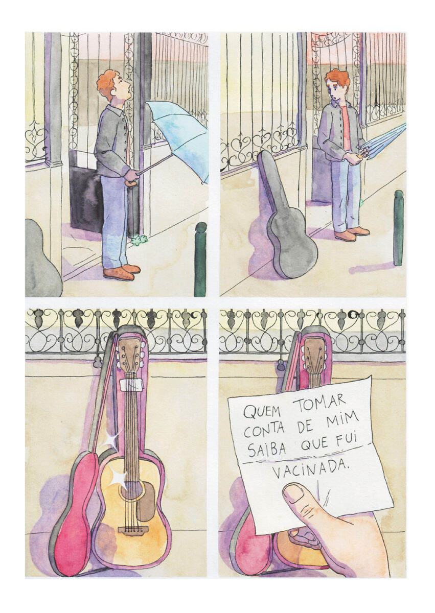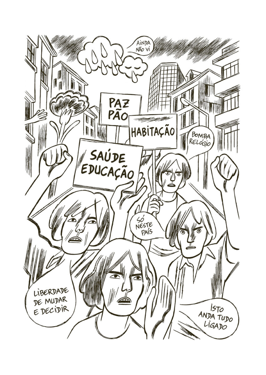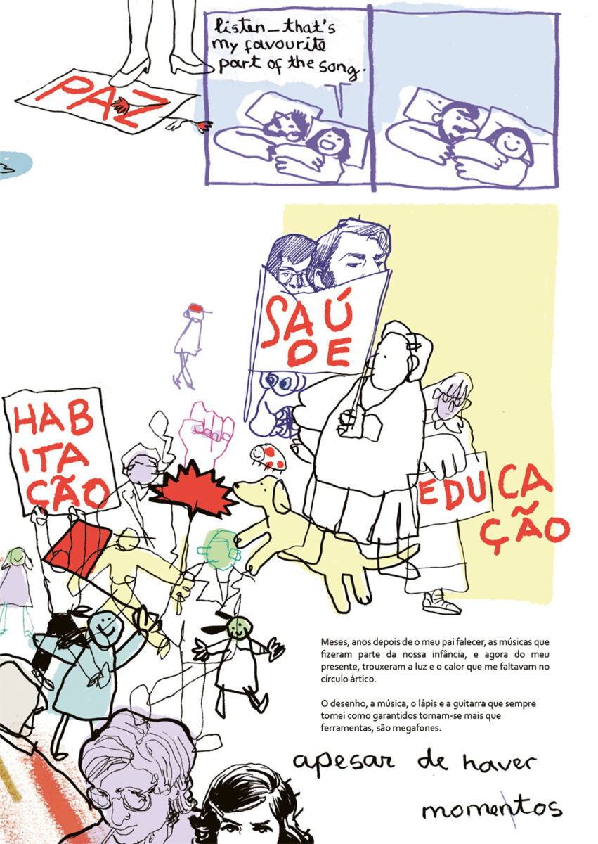 Já o preto e branco de linha clara usado por Pedro Burgos utiliza versos de diferentes canções de Sérgio Godinho para compor um instantâneo contemporâneo, um olhar atento e crítico sobre os tempos que partilhamos. A composição das pranchas, cada uma enquadrando um espaço partilhado – uma rua, o interior de uma carruagem de metropolitano, um jardim –, permite uma dupla leitura: o cenário completo, mas também a sequência de momentos dentro desse espaço, criando um movimento potencialmente narrativo. Por aqui passam as pessoas que dorme na rua (cada vez mais), o problema da habitação, a pobreza que atinge mesmo quem trabalha e recebe um salário, mas nem assim pode pagar uma casa, os imigrantes encostados à parede, na rua do bem Formoso ou em tantos outros sítios. Também há esperança nestas páginas, atravessadas por pedaços líricos que ora reclamam «a paz, o pão, a habitação, saúde, educação», ora lembram que «hoje fiz um amigo e coisa mais preciosa no mundo não há». Seria fácil resvalar para a mera lista de versos, mas o trabalho de Pedro Burgos escapa com brio desse lugar-comum e cria uma narrativa que recorta a linha do tempo e nos obriga a olhar para o presente, mostrando-o único e por transformar, mas que, sem contradição, também sublinha o que não muda ao longo do tempo, mesmo que com diferentes protagonistas: dores, amores, velhice, «dói-me a parte interna de uma perna».