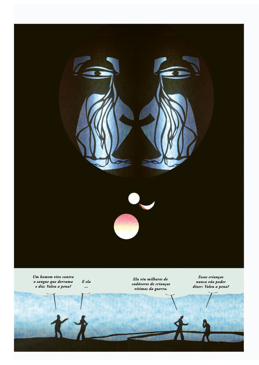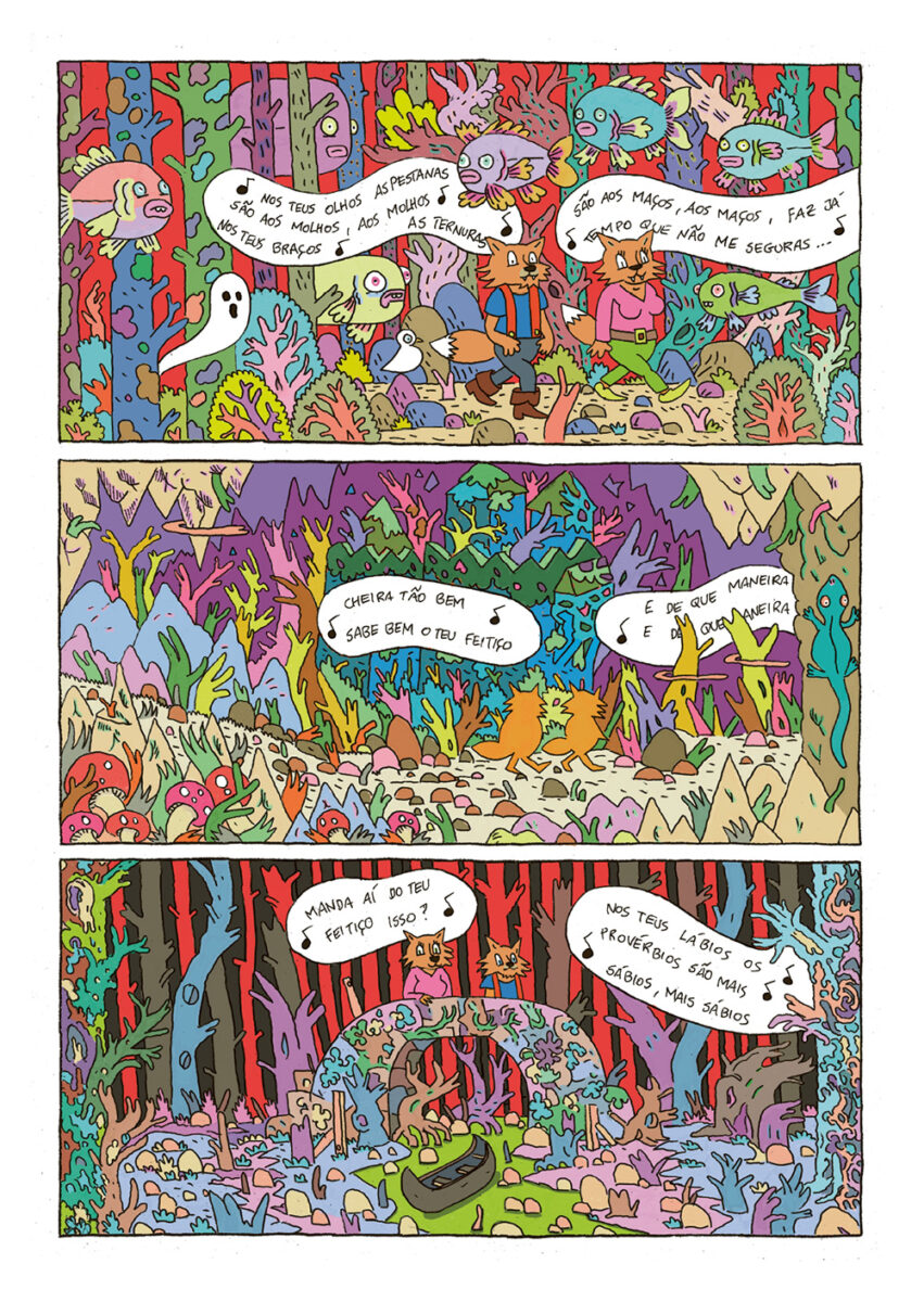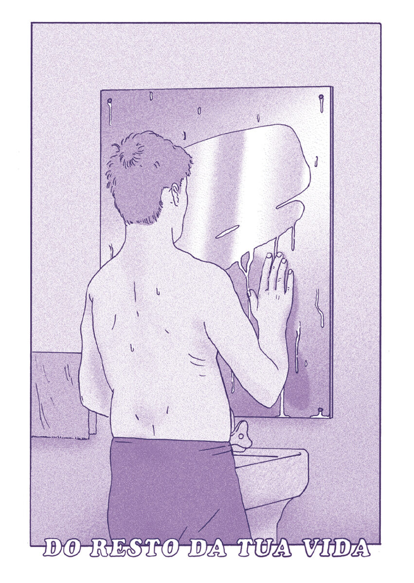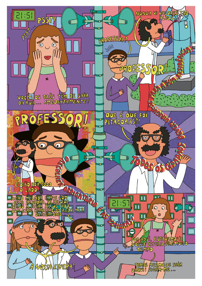 Já o preto e branco de linha clara usado por Pedro Burgos utiliza versos de diferentes canções de Sérgio Godinho para compor um instantâneo contemporâneo, um olhar atento e crítico sobre os tempos que partilhamos. A composição das pranchas, cada uma enquadrando um espaço partilhado – uma rua, o interior de uma carruagem de metropolitano, um jardim –, permite uma dupla leitura: o cenário completo, mas também a sequência de momentos dentro desse espaço, criando um movimento potencialmente narrativo. Por aqui passam as pessoas que dorme na rua (cada vez mais), o problema da habitação, a pobreza que atinge mesmo quem trabalha e recebe um salário, mas nem assim pode pagar uma casa, os imigrantes encostados à parede, na rua do bem Formoso ou em tantos outros sítios. Também há esperança nestas páginas, atravessadas por pedaços líricos que ora reclamam «a paz, o pão, a habitação, saúde, educação», ora lembram que «hoje fiz um amigo e coisa mais preciosa no mundo não há». Seria fácil resvalar para a mera lista de versos, mas o trabalho de Pedro Burgos escapa com brio desse lugar-comum e cria uma narrativa que recorta a linha do tempo e nos obriga a olhar para o presente, mostrando-o único e por transformar, mas que, sem contradição, também sublinha o que não muda ao longo do tempo, mesmo que com diferentes protagonistas: dores, amores, velhice, «dói-me a parte interna de uma perna».