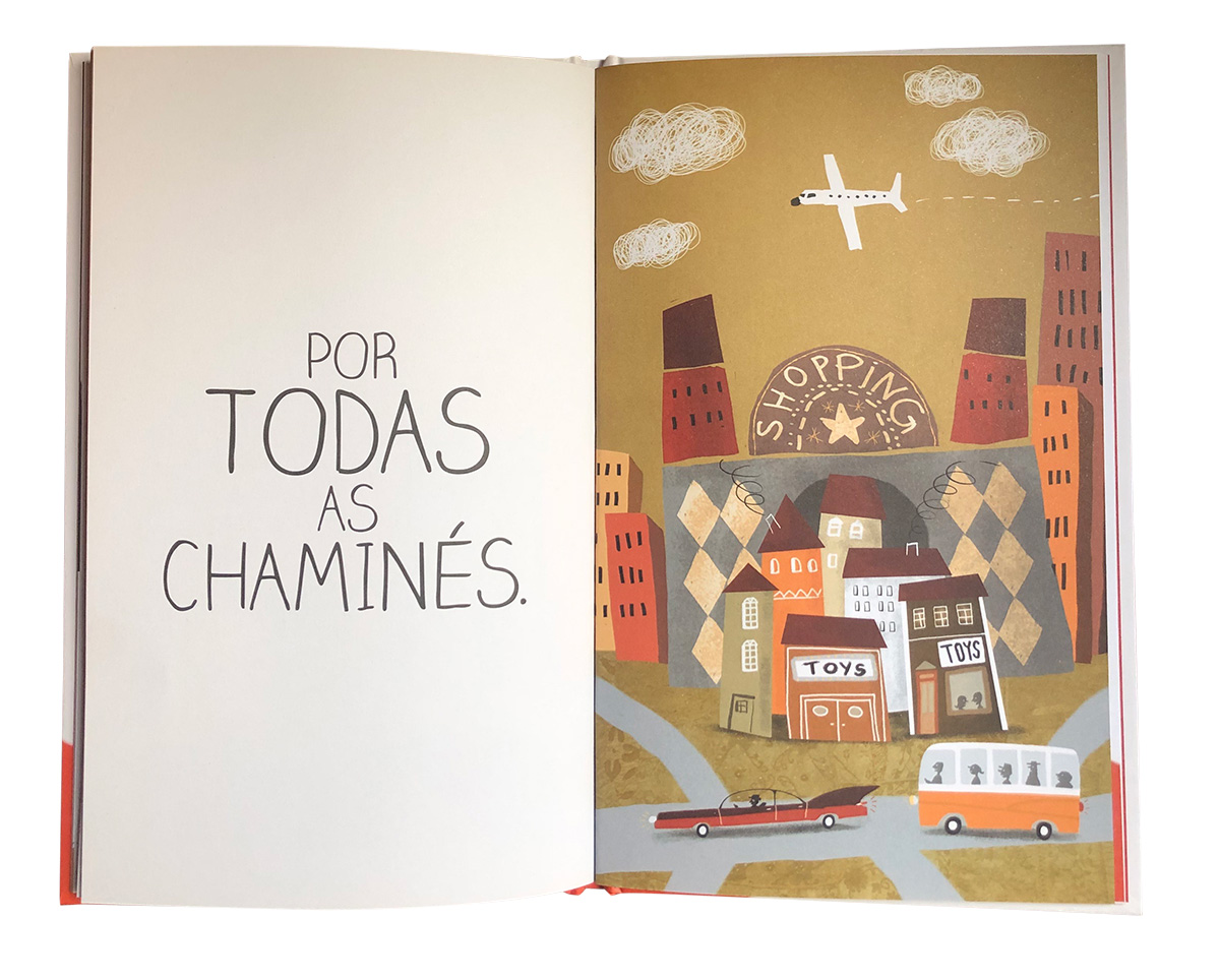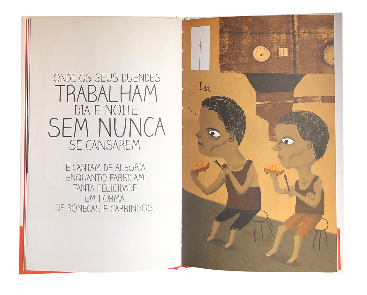 O maior contraste verifica-se quando se observa o texto e a ilustração sobre o trabalho na fábrica e o momento final, com a chegada das prendas a casa das crianças. Os tons escuros, cinzas e pardos contrastam com os vermelhos, rosas e castanhos. As crianças sujas, com rostos deformados, descalças e com roupas rasgadas estão sentadas em bancos a acabar carrinhos de brincar. O texto é o seguinte: “onde os seus duendes trabalham dia e noite sem nunca se cansarem. E cantam de alegria enquanto fabricam tanta felicidade em forma de bonecas e carrinhos.” Já no final, à imagem de duas crianças sorridentes a quem não faltam óculos, sapatos e roupas festivas, assim como uma árvore de natal decorada a rigor, corresponde esta frase: “E é assim que os meninos bem-comportados recebem as suas prendas.”