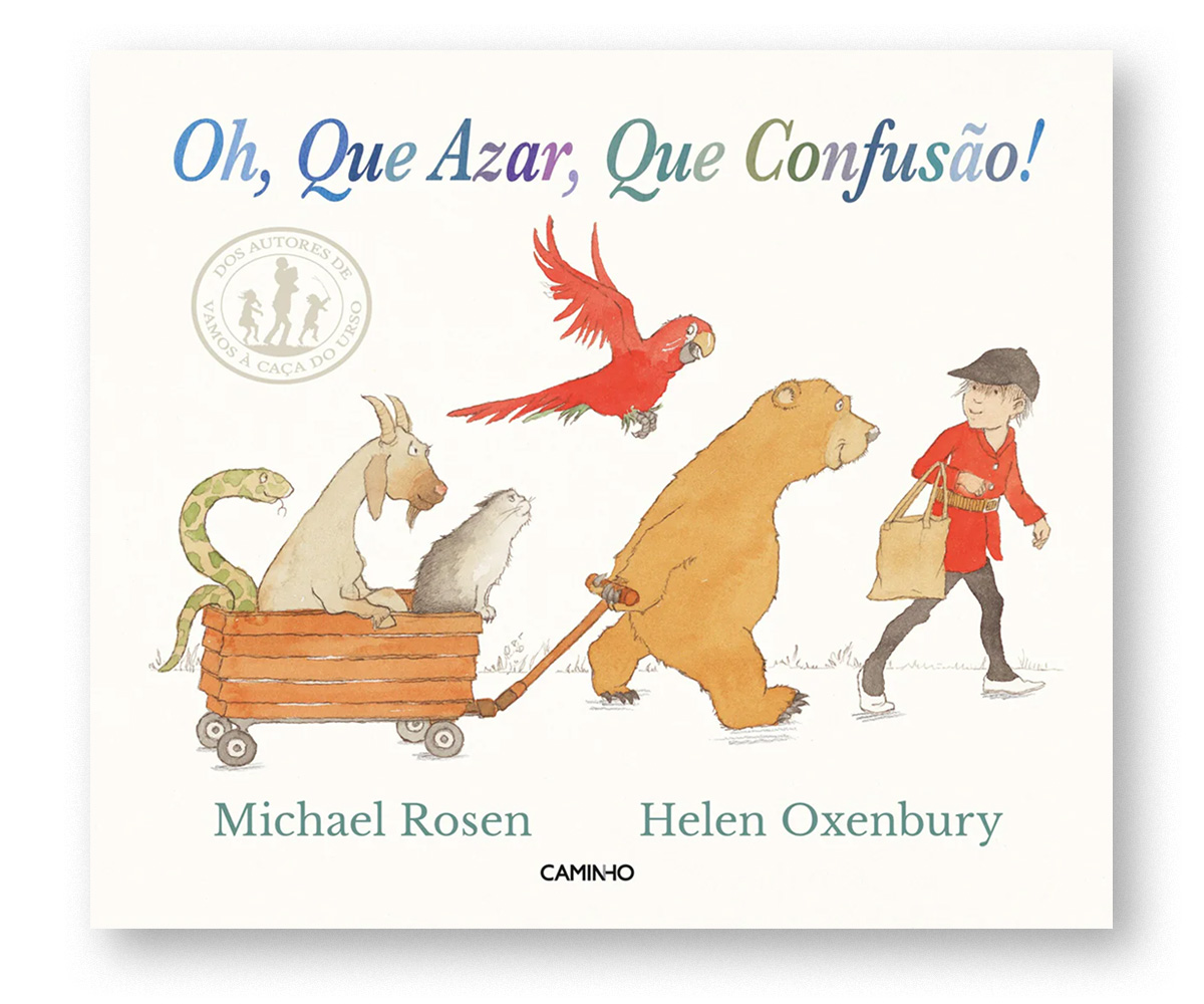 A estrutura é semelhante mas o universo temático bastante distinto. Trata-se, desta feita, de uma sucessão de equívocos que provocam distúrbios ao redor da criança, protagonista e narradora. De cada loja onde vai, com a intenção de comprar um produto concreto (uma cenoura, um chapéu, um casaco, uma torta, um sofá ou uma chávena), regressa com um animal embrulhado. O texto repete-se, respeitando um refrão que antecipa o infortúnio. Em simultâneo, o caminho para cada nova loja faz-se não companhia dos animais que vão chegando. O pequeno pré-leitor facilmente se relaciona com a história pela estrutura previsível de repetição e antecipação. A rima alimenta a cadência do texto que prima pelo cuidado na escolha do pouco vocabulário presente. A ilustração reforça a confusão, apresentando-a sempre com a criança a manifestar expressivamente o seu estado de espírito. O movimento dos animais também contribuem para esta dinâmica. Ritmo textual e representação figurativa sustentam a narrativa. No final, uma reviravolta traz de novo a paz a quem a perdeu, acrescentando ainda alegria e festa. Michael Rosen e Helen Oxenbury não desiludem. Continuam a ser uma referência para a primeira infância e para todos os mediadores, formais e informais.