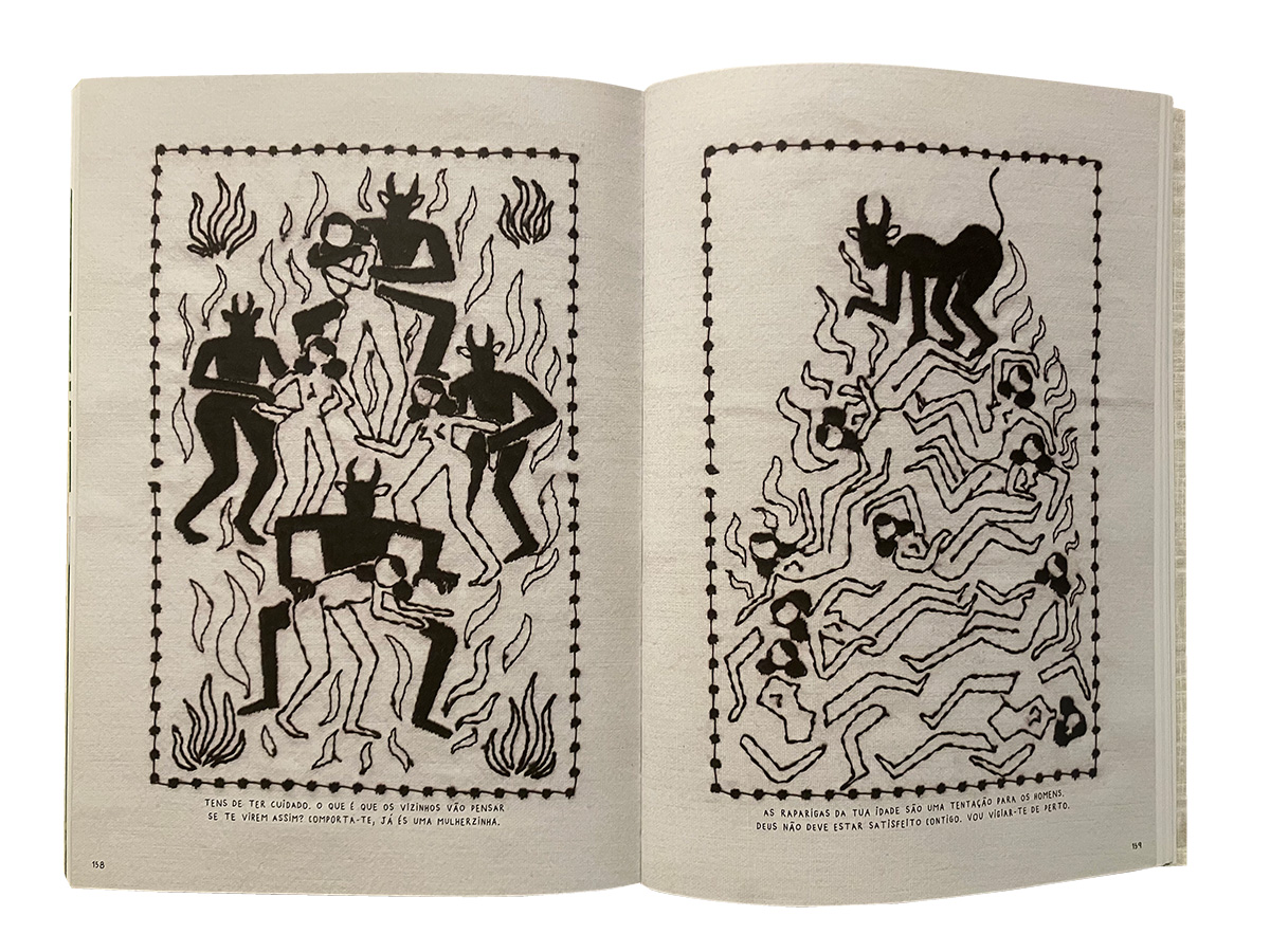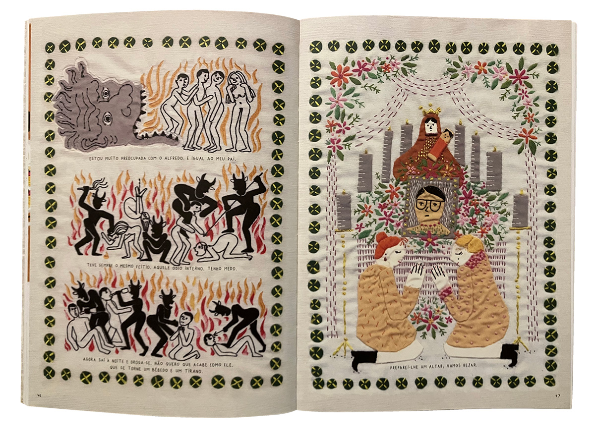 O livro já estava muito avançado. Não foi uma ideia que tivesse tido no início, foi algo casual. Na verdade, a minha mãe nunca quis ensinar-me a coser, queria que eu estudasse, que fosse para a universidade, coisa que ela não pôde fazer. A ideia surgiu porque eu tenho em casa uma colecção de arpilleras, uns bordados típicos da América Latina, e o que aconteceu foi que, durante a pandemia, resolvi usar essa técnica para reproduzir uma das pranchas que já tinha feito para o livro, aquela que tem o altar. Fiquei muito entusiasmada com o processo, que é lento, calmo, é um processo de aprendizagem em que a imagem se vai revelando aos poucos. E nessa altura comecei a investigar, a ler, sobre a história das arpilleristas, e descobri as arpilleristas chilenas, que eram mulheres que, durante a ditadura de Pinochet, usavam essa forma de criação para denunciar a violência que se estava a viver no país, os “desaparecimentos”, os sequestros. E aquilo pareceu-me muito revolucionário, que um grupo de mulheres organizadas por uma artista chamada Valentina Bonne, que as juntou, usasse a costura para fazer aquilo, provavelmente porque a costura era algo que todas sabiam como fazer, até porque esse ofício foi sempre imposto às mulheres e nunca foi pensado como uma forma de expressão.