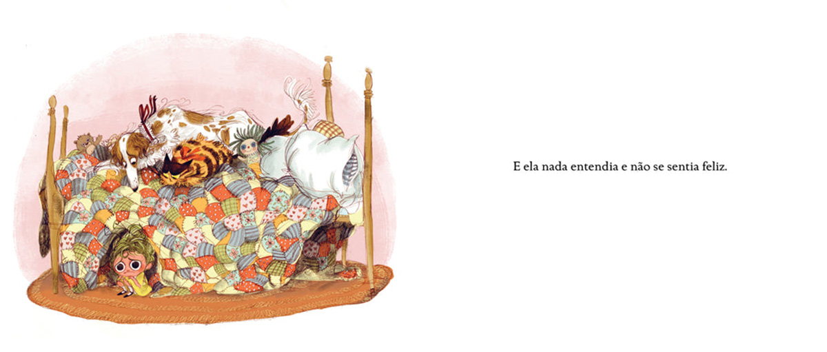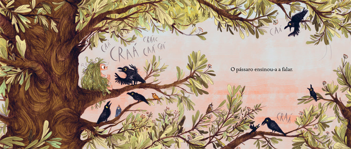 O traço de Emily Hughes preenche os espaços com muitas linhas e cores, figuras naturais e objetos que se cruzam, tocam e sobrepõem parcialmente. São espaços intensos, que refletem a alegria e a liberdade da selva por oposição aos espaços fechados da cidade. A criança pertence ali porque as cores e os movimentos a integram no espaço tornando difusas as fronteiras do seu corpo no espaço onde se encontra. Na cidade a menina encolhe o corpo que nunca se apresenta em harmonia com o contexto.