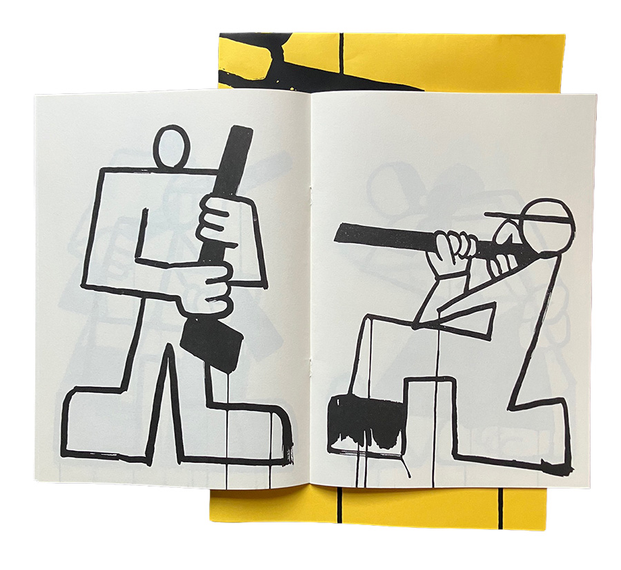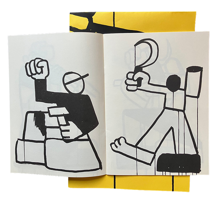 Os traços espessos, quase sempre saturados de tinta, remetem para essas pinturas colectivas que povoaram – a ainda vão surgindo – paredes um pouco por todo o país. Em cada página da plaquete que integra Todos Contra Todos, bem como no poster de fundo amarelo, figuras em posição de luta, protesto, conquista ocupam os seus lugares, umas vezes de mãos nuas, outras agarrando em foices, bandeiras e outros objectos. Bruno Borges já não consegue situar as diferentes etapas deste processo que o levou a criar a galeria de personagens que começou por existir nas paredes da ZDB e que, agora, podemos ver no papel impresso: «Acho que já devia ter a ideia mais ou menos definida à partida, antes de começar a desenhar. Muitas vezes, isso não acontece comigo; é quase sempre o desenho que me puxa numa direcção, que só depois é determinada pela leitura que eu próprio faço a partir dele. É muito possível que isso também tenha acontecido, num momento inicial, num outro formato. A coisa comigo não se passa a um nível racional, eu tenho primeiro de fazer acontecer e seguir uma metodologia que é sobretudo intuitiva no desenho; ainda que depois siga pensando naquilo. Também foi uma coincidência, na altura, estar a preparar a pintura de uns panos com a Oficina Arara, em que algumas destas figuras já apareciam, numa peça colectiva alusiva ao 25 de abril, e serem pensadas em simultâneo. A técnica é quase sempre a mesma, tinta-da-china sobre papel. Os desenhos finais existem no tamanho 70 x 50 cm – um formato que é relativamente banal em impressão. Comecei a desenhar nestes papéis na Arara, com muito espaço e imenso papel à disposição, diretamente com o pincel. Gosto de desenhar na vertical, para aproveitar os escorridos da tinta, como se estivesse a espichar uma parede. É uma coisa muito uga uga!»